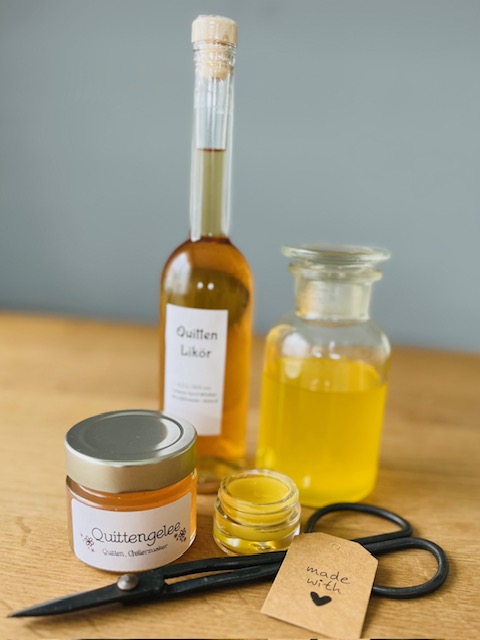 Die Quitte kann in so vielen verschiedenen Formen angewendet werden. Ich mache immer einen Ölauszug den ich dann zu Salben verarbeite, mein geliebtes Quittengelee und heuer gab es auch einen Quittenlikör.