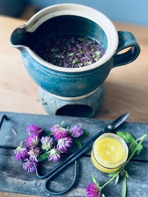 - Die frischen Blütenköpfchen werden zerkleinert und im Salbenstövchen mit Öl bedeckt. Hier verwende ich sehr gerne ein Sonnenblumenöl.