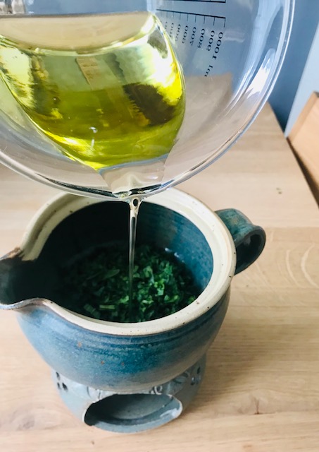 - Die frischen Spitzwegerichblätter werden zerkleinert und im Salbenstövchen mit Öl bedeckt. Hier verwende ich ein gutes natives Ölivenöl Bio
