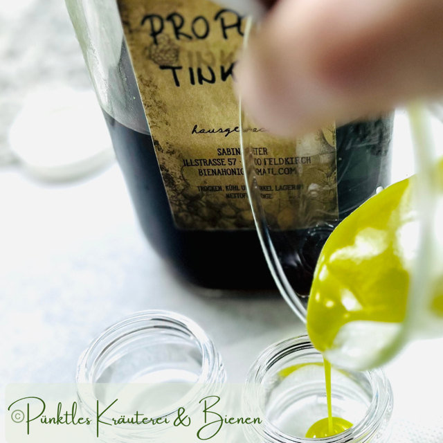 - Aus dem Wasserbad nehmen, etwas abkühlen lassen und Propolistinktur hinzufügen